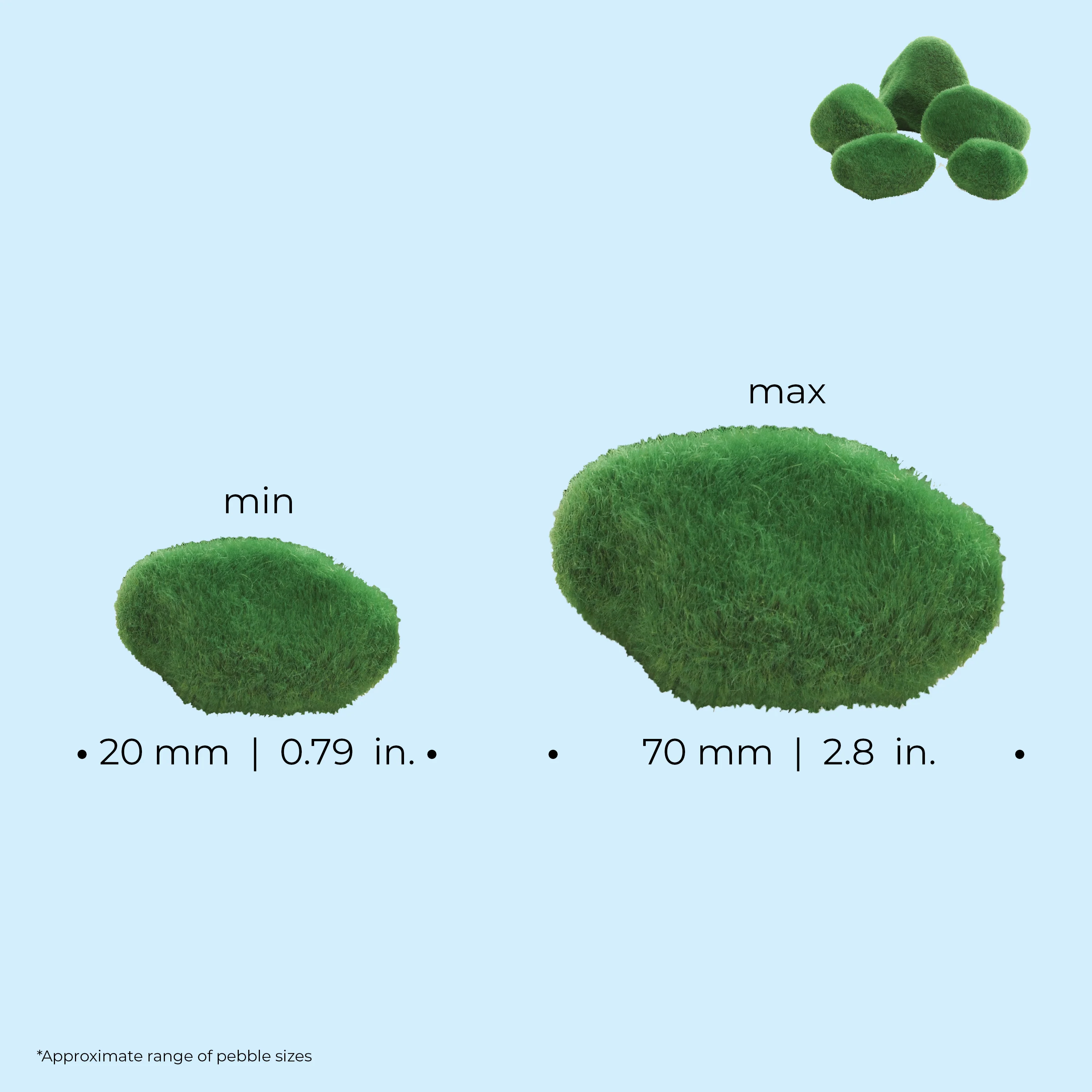 - CONVENIENTLY SIZED — These pebbles fit in any aquarium. The largest is 2.8 inches (70 mm) in diameter, while the smallest is 0.79 inches (20 mm) in diameter.