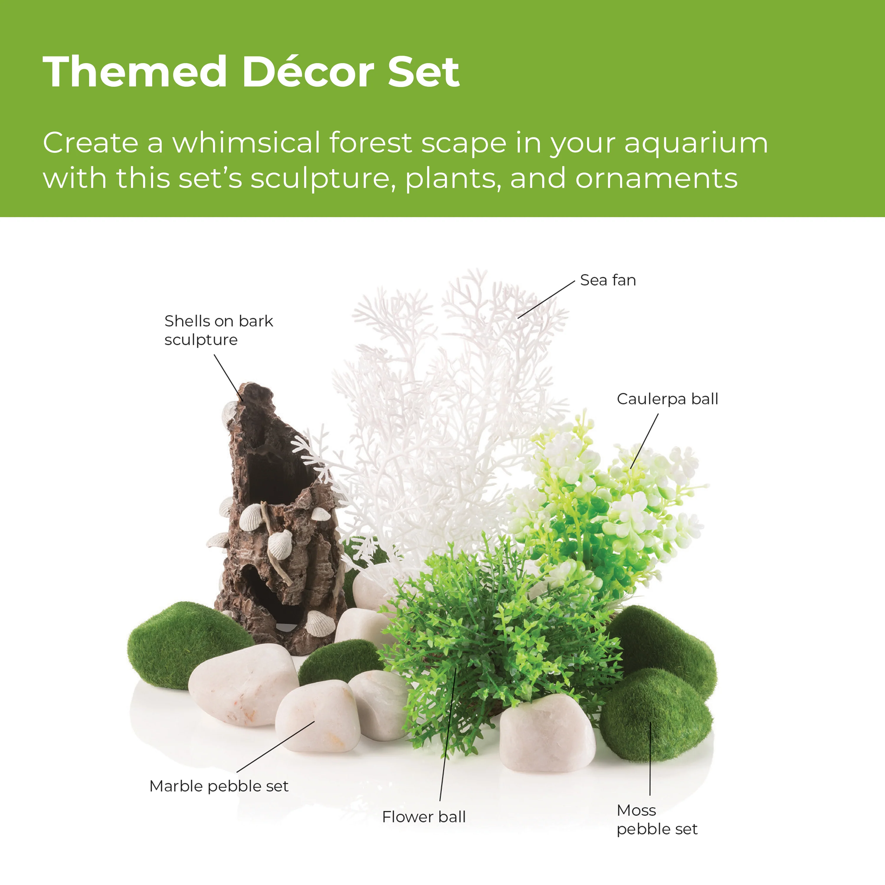 - DECORATE YOUR AQUARIUM IN A SNAP! biOrb Décor Sets are a themed collection of some of our favorite pieces, curated for your aquarium. This set features a shells on bark sculpture, white sea fan, green flower ball, green Caulerpa ball, faux moss pebbles, and white marble pebbles. Each perfectly complements the others.